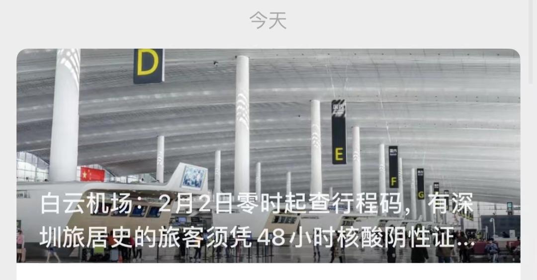根据广州市疫情防控要求,白云机场2月2日零时起在航站楼入口处查验所有人员(包括旅客和接送机人员)的行程卡信息,如行程记录显示有14天内深圳旅居史的旅客,须另行提供48小时核酸检测阴性证明方可进入航站楼。有出行计划的旅客请提前了解最新防疫政策,在确认核酸检测结果更新后再前往机场,以免影响出行。