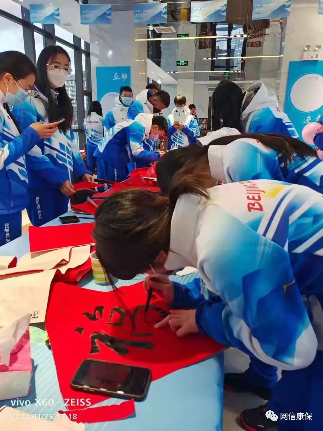 除夕下午的景泰山麓热闹了起来,志愿者们在一起,挥毫泼墨,用心把祝福,把对冬奥会的祈盼,对未来的祈愿,在大大的红纸上,一撇一捺,一笔一画写起来。一个一个福字,一个个喜庆带着祝福的对联,在大家的笔下行云流水的流淌絮语……