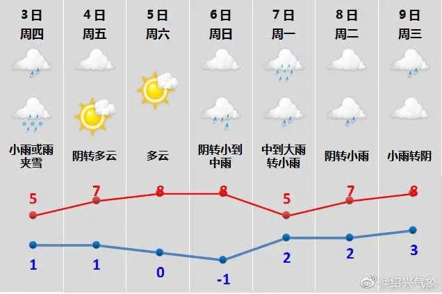 绍兴市气象台2022年2月3日16:00发布的天气预报:今天傍晚到前半夜阴有小雨,部分雨夹雪或雪,山区雨夹雪或雪,后半夜雨雪渐止转阴,明天阴转多云,今天夜里到明天早晨局部有雾。东北风3级,明天最高气温:6~7℃,明天最低气温:1~2℃,山区-1~1℃,有霜冻或薄冰。后天多云,0~8℃。预计2月4日空气质量为优-良,首要污染物为PM2.5/PM10。