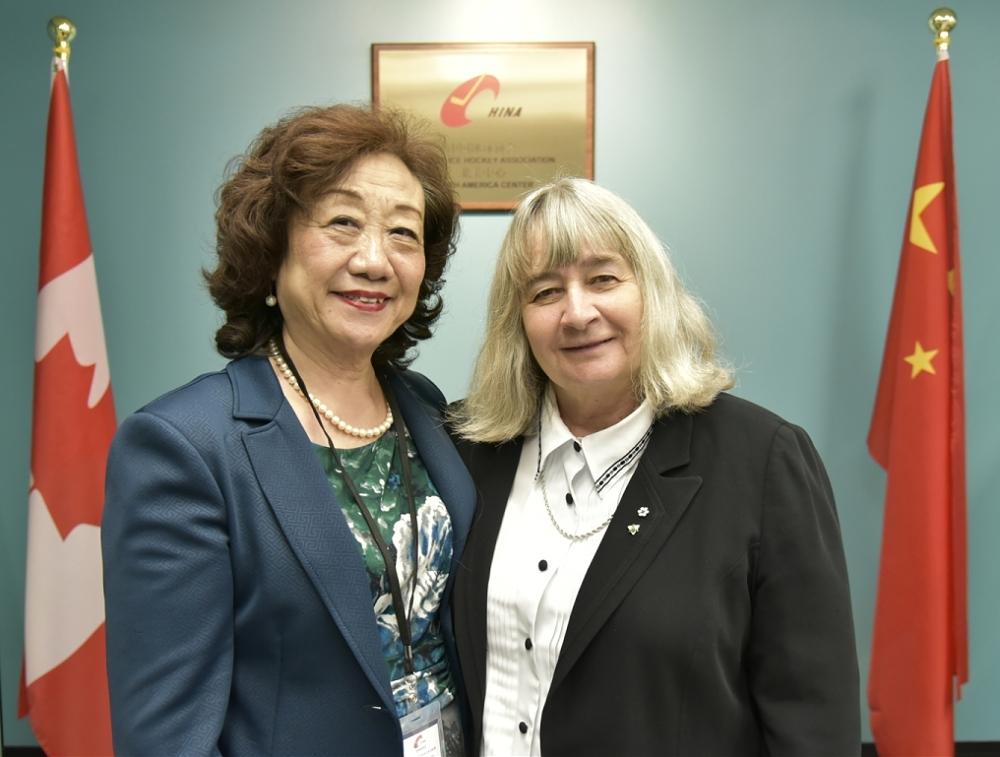 中国冰协北美中心主任、加中体育文化交流中心理事长韩进雯(左)和安大略省女子冰协主席弗兰·里德合影。(中国冰协北美中心提供)