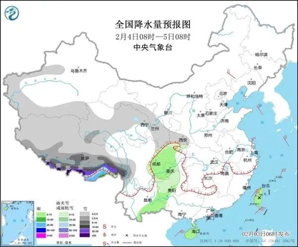 中央气象台预计,明天,青藏高原大部、甘肃东部、陕西中南部、贵州西北部等地的部分地区小到中雪或雨夹雪,其中,西藏南部等地部分地区有大到暴雪,局地大暴雪或特大暴雪(30~35毫米)。四川盆地、贵州西南部、云南东南部、海南岛、台湾岛等地部分地区有小到中雨,其中,西藏东南部有大雨。内蒙古东南部部分地区有4~5级风。