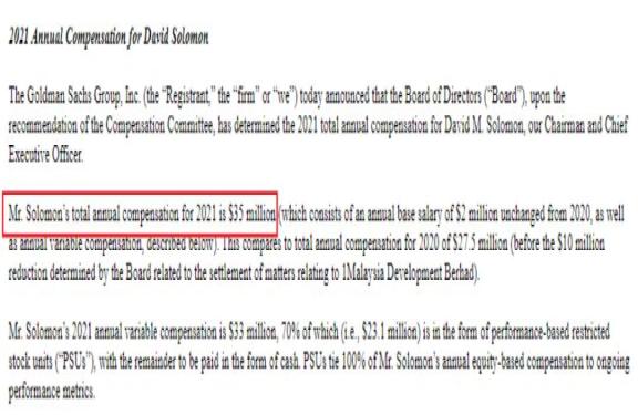从高盛官方公布的所罗门的薪资构成来看,200万美元底薪(约1300万人民币),浮动薪酬为3300万美元(约2.1亿元人民币),其中70%为(2310万美元)为股票,30%为现金支付。