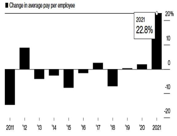 三家顶级投行的CEO:摩根大通的戴蒙、高盛的所罗门和摩根士丹尼的戈尔曼,2021年的薪酬均达到约3500万美元(约合2.2亿元人民币),创下自2007年金融危机前最高水平。高盛CEO的薪酬更是较2020年直接翻番。