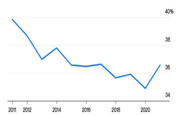 华尔街五大行及德意志银行的薪酬开销占营业收入的比率变化