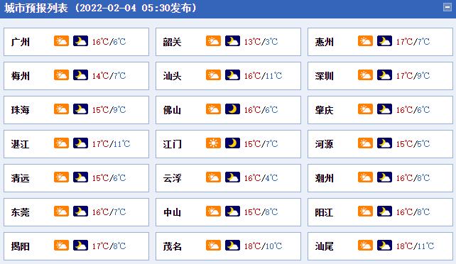4日(初四),全省大部市县多云间阴天。最低气温:粤北和珠江三角洲的北部市县3~5℃,高海拔山区零下2~1℃,有冰冻;粤西、粤东和珠江三角洲的南部沿海市县10~12℃,其余大部分市县6~9℃。