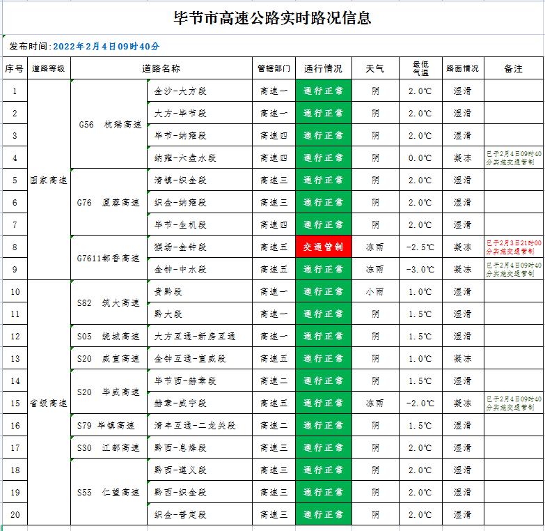 截至2月4日9时40分,毕节辖区高速公路新增解除交通管制路段为杭瑞高速纳雍至六盘水段、都香高速金钟至中水段、毕威高速赫章至威宁段。