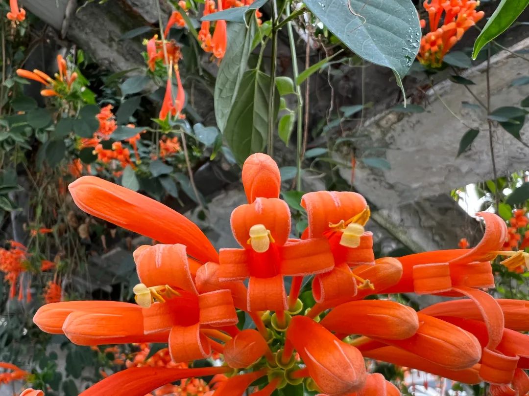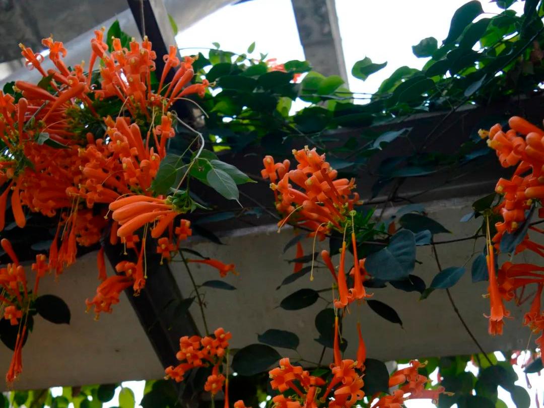 炮仗花呈橙色,花萼钟状,花冠筒状,其花蕾在花开后会反折,十分优美。花期1-6月,每年在春节前开放,非常迎合节日气氛。