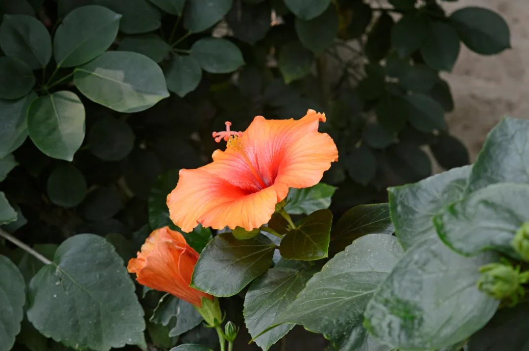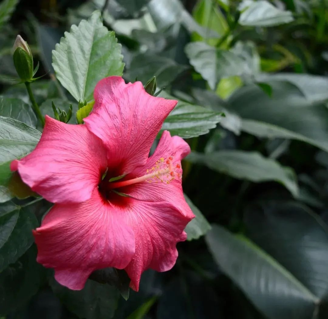 朱槿花色鲜艳,多为红色、粉色和橙色,花朵硕大,花冠漏斗形,也有重瓣品种,可四季开花。