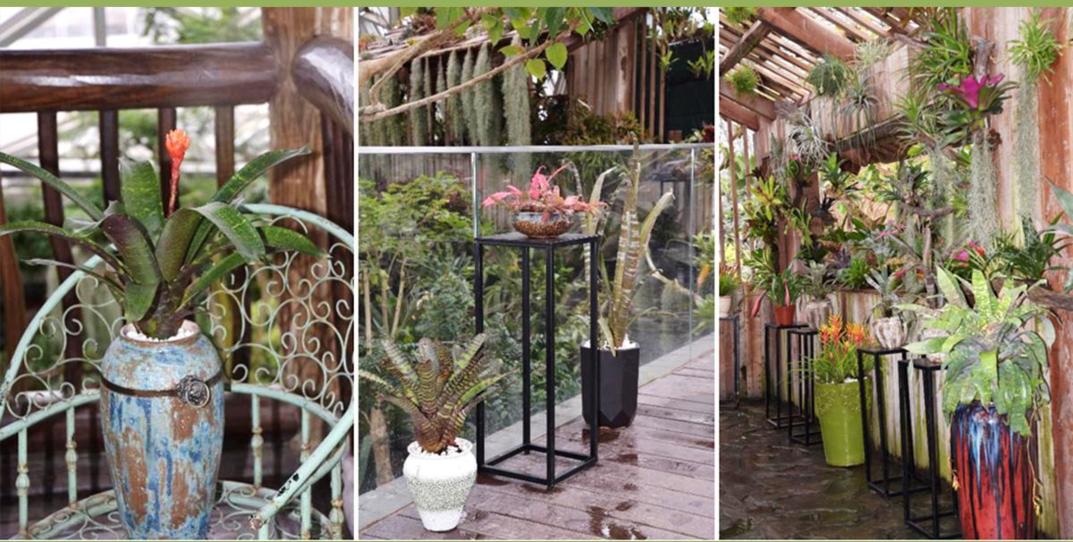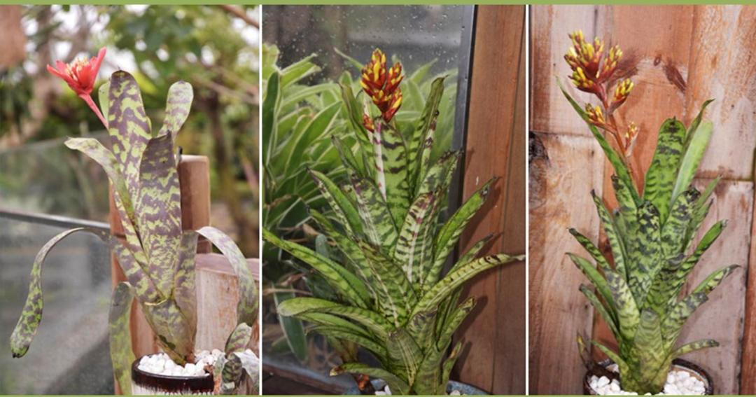 ‘尖萼荷’、‘姬凤梨’、‘彩叶凤梨’、‘鹦哥凤梨’的叶片上虎斑纹种类最为丰富,它们也是此次展出的“主力军”,其中‘姬凤梨’和‘彩叶凤梨’主要以观叶为主,而其他几个属的种类即可观叶又可观花,例如正值花期的‘辉煌’丽穗凤梨、虎斑莲苞凤梨、彩瓶果子蔓等。