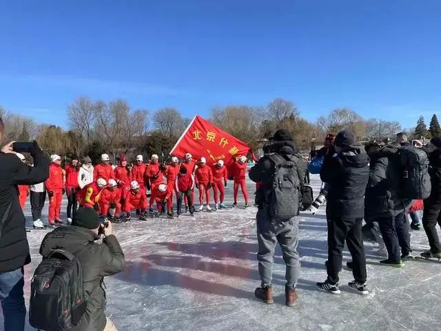 28家媒体的60余名中外记者在什刹海冰场体验老北京冰雪趣味运动
