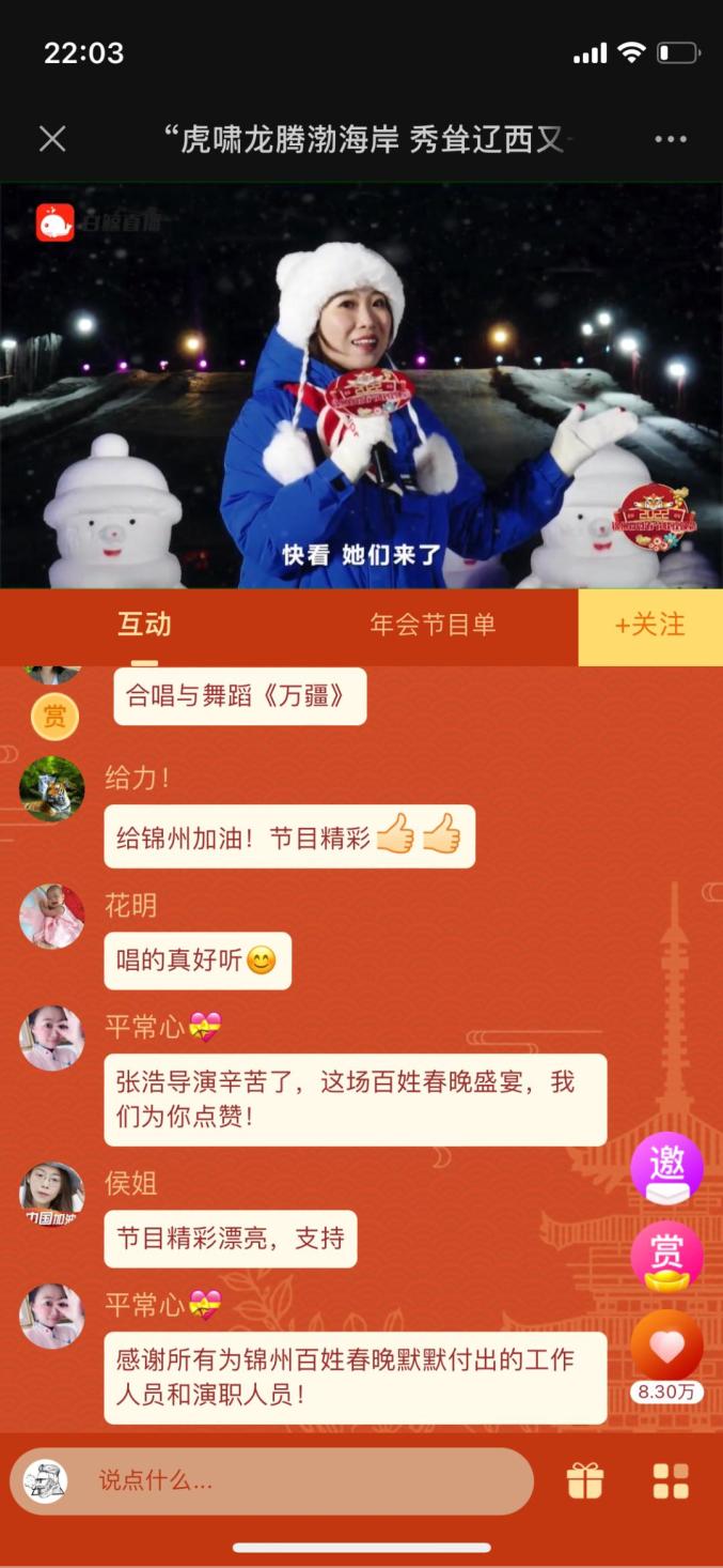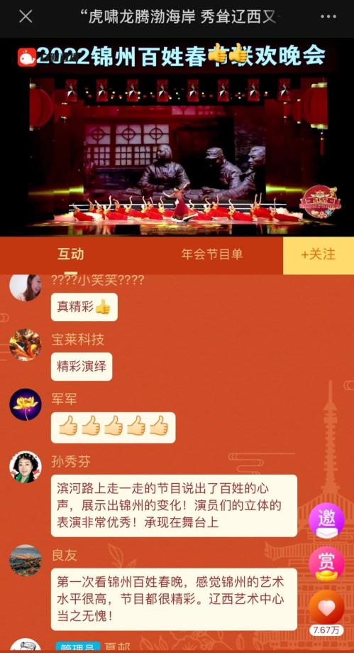由锦州新闻媒体集团主办,锦州新闻传媒产业(集团)有限公司承办,凌海九华山风景区有限责任公司和渤海湾房地产开发(辽宁)有限公司倾力协办的“虎啸龙腾渤海岸 秀耸辽西又一春”2022年锦州百姓春节晚会于1月29日由锦州广播电视台新闻综合频道、教育频道、公共频道首播,并由央视频、新华社现场云、白鲸直播等新媒体平台进行了同步的网络直播。晚会播出后,在锦城市民中间引起了热烈反响,截至目前,仅锦州新闻媒体集团新媒体直播平台白鲸直播上,观看晚会直播和回放的人数就已经突破50万人次。