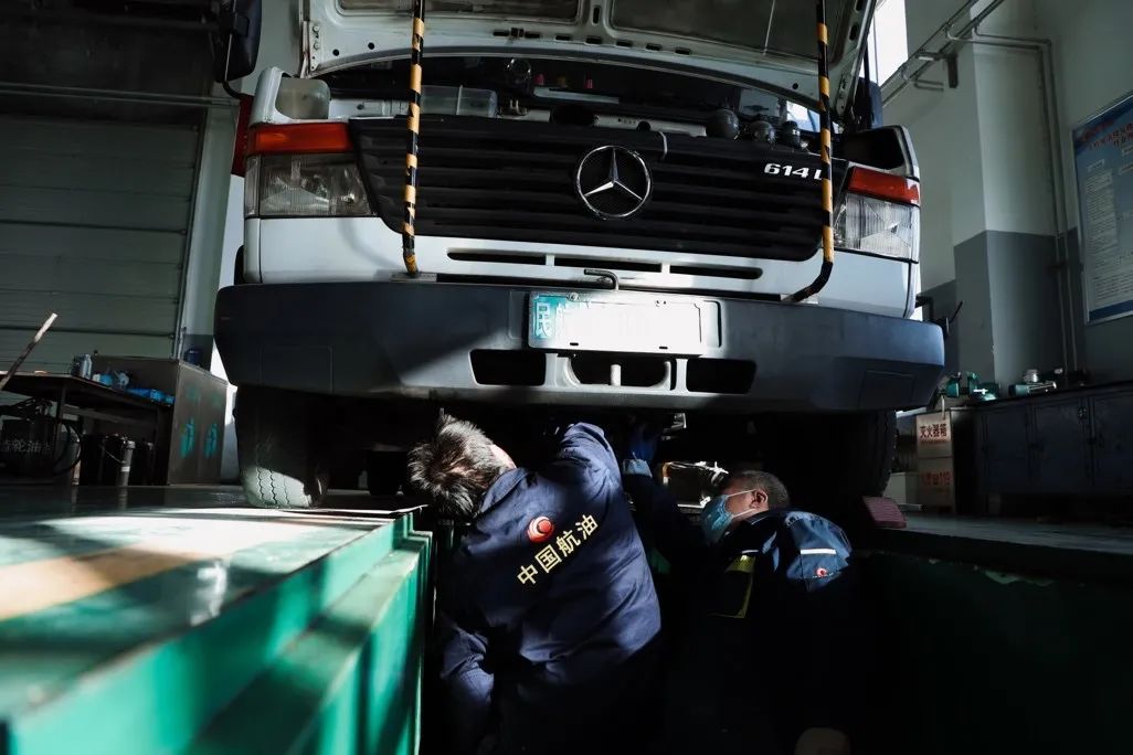 特设维修员正在车间检查保障冬奥航班加油车运行情况