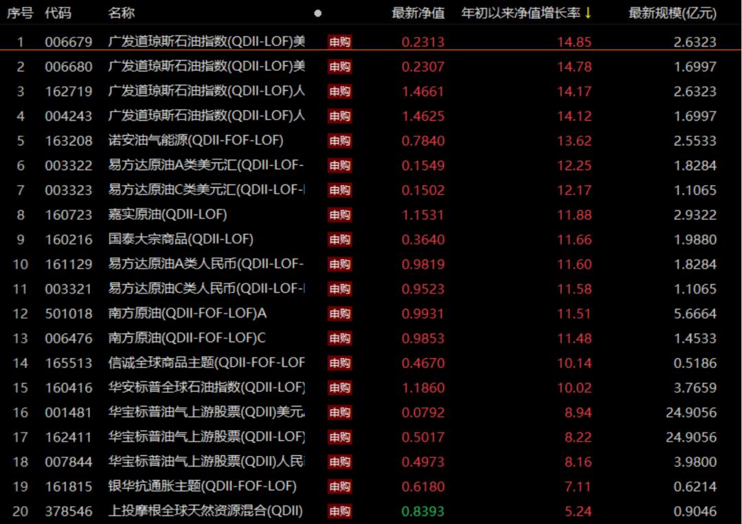 在QDII基金方面,广发道琼斯石油指数,诺安油气能源,今年以来的涨幅13%~14%,排在第15位的华安标普全球石油也上涨10%,排在后面的还有华宝标普油气。这些基金都直接与原油价格挂钩,好几只都属于FOF,投资的是全球市场上的原油类ETF。