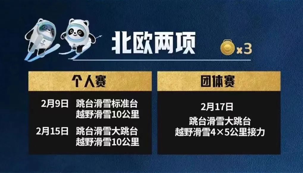 2022年北京冬奥会的北欧两项将会产生三枚金牌,分别是:男子个人标准台+10公里越野滑雪、男子个人大跳台+10公里越野滑雪和男子团体(每队派四名队员参赛,大跳台+4×5公里越野滑雪接力)。