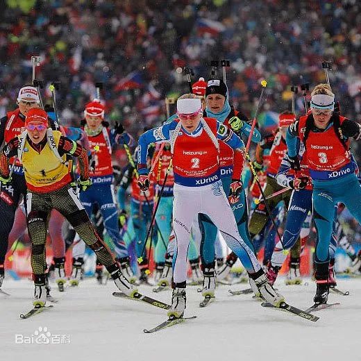 冬季两项比赛时,运动员要脚穿滑雪板,手持滑雪杖,身背专用小口径步枪,沿标记的滑道,按正确的方向和顺序滑完预定的全程。每滑行一段距离进行一次射击,最先到达终点者获得优胜。