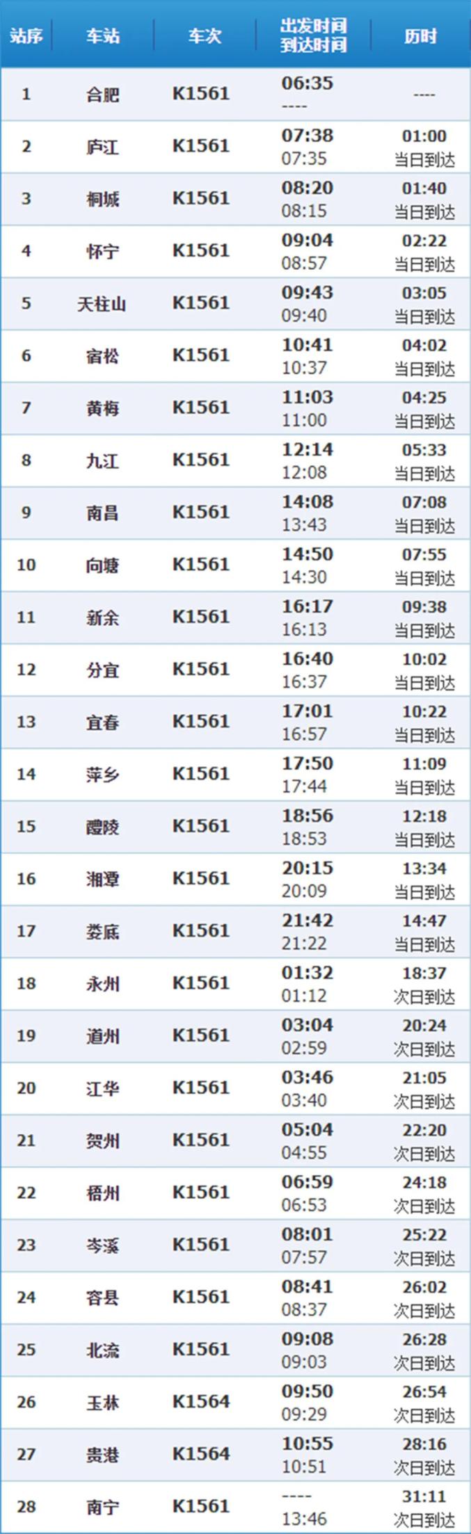 K1561次列车时刻表