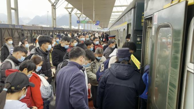 因节后返程客流增大,务工流、探亲流等客流相互交织,造成车站客流加大。大家乘坐火车出行,请提前出门,预留一小时左右进站安检。