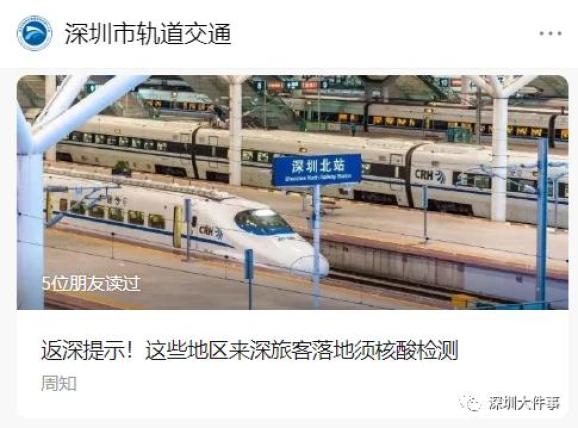 “深圳市轨道交通”发布最新提示乘坐途径中高风险地区列车的旅客抵深须落地核酸检测。