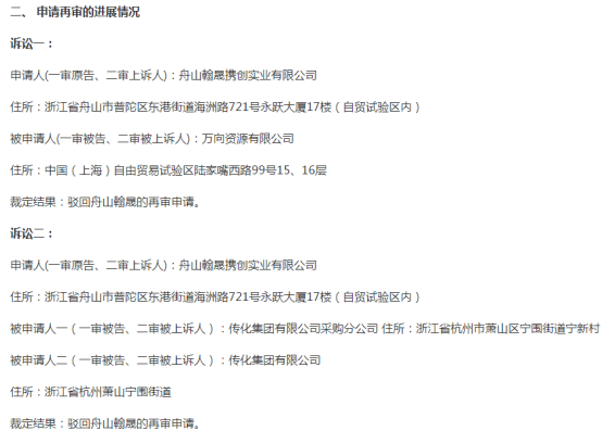 除了顺特设备外,顺纳股份控股孙公司舟山翰晟携创实业有限公司(以下简称“舟山翰晟”)也陷入诉讼风波。2021年12月8日,顺钠股份发布《关于控股孙公司诉讼案件的进展公告》,公告中披露了2019年其控股孙公司舟山翰晟与传化集团有限公司采购分公司、传化集团有限公司(以下简称“传化集团”)买卖合同纠纷案和舟山翰晟与万向资源有限公司(以下简称“万向资源”)买卖合同纠纷案两起案件的进展情况,两起案件的裁定结果均为法院判定驳回舟山翰晟的再审申请。