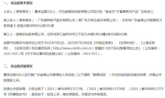 此外,顺钠股份自身在2021年亦陷债权人代位权纠纷案。2021年7月1日,顺钠股份发布公告称,曹承运等101人因向顺钠股份索要产品回购款被广东省佛山市顺德区人民法院判定驳回请求后,再次向佛山中院提起上诉,经佛山中院审查,裁定驳回曹承运等101人的上诉请求,维持原裁定结果。