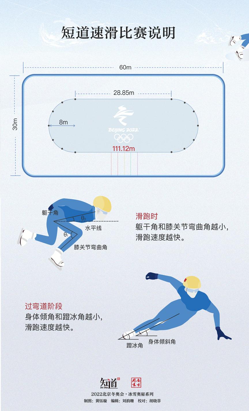 简单来说,短道速滑就是运动员脚踩冰刀,以特定姿态,在周长111.12米、弯道半径8米的椭圆形赛道上完成特定距离的逆时针滑跑。