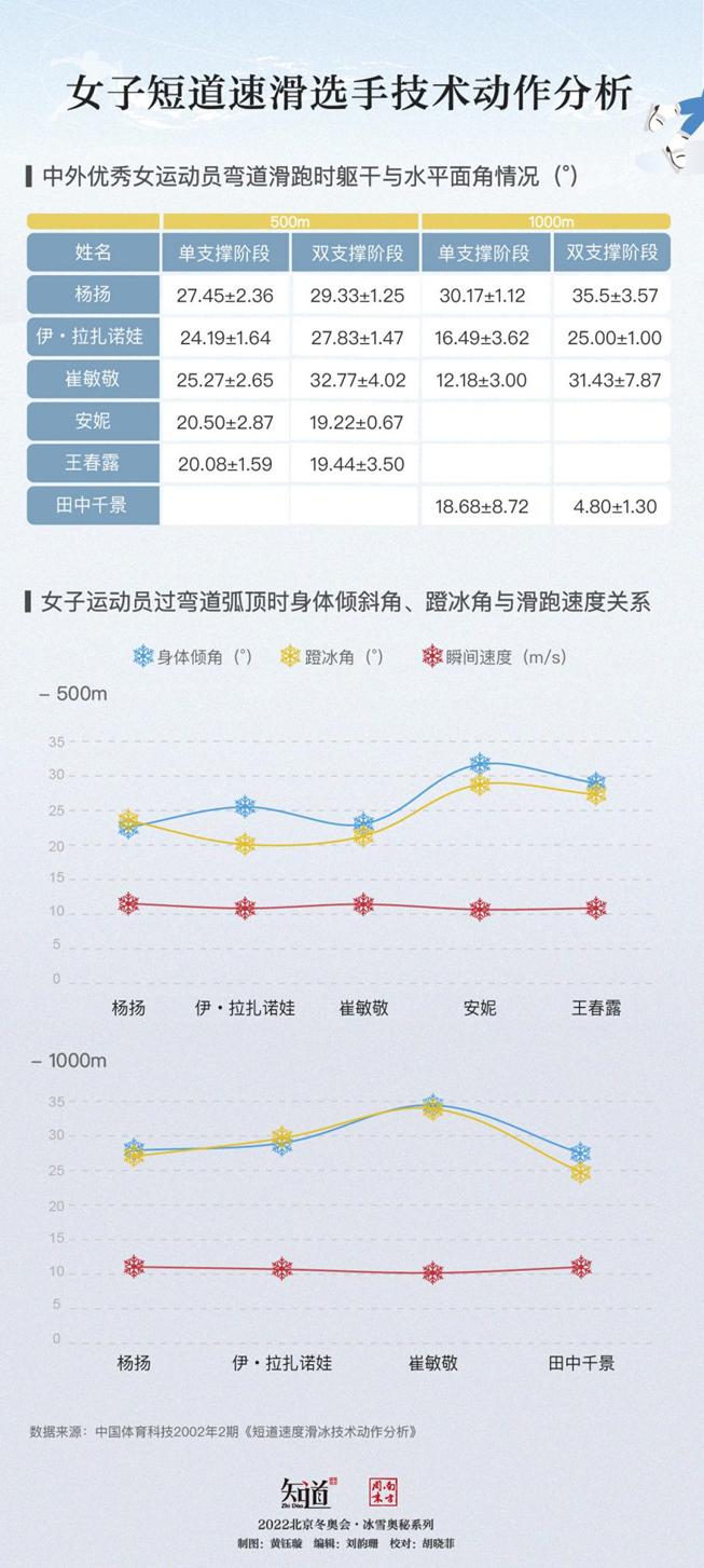 而在过弯道阶段,身体倾角和蹬冰角越小,说明运动员的侧向倾倒程度就越大,所获得的向心力也越大,滑跑速度越快。