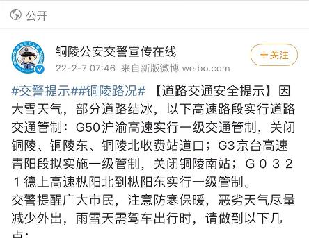 因大雪天气,部分道路结冰,以下高速路段实行道路交通管制:G50沪渝高速实行一级交通管制,关闭铜陵、铜陵东、铜陵北收费站道口;G3京台高速青阳段拟实施一级管制,关闭铜陵南站;G0321德上高速枞阳北到枞阳东实行一级管制。
