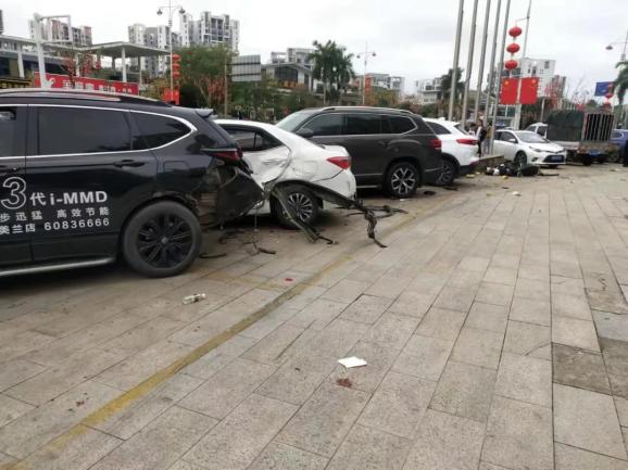 后连续碰撞上琼C3B×××号牌小型轿车、琼A8×××W号牌小型客车、冀DQ0×××号牌小型轿车、琼CJ7×××号牌小型客车、琼AD58×××号牌小型客车等五辆车,造成坐在琼A8×××W号牌小型客车上的陈某宇(男,37岁,海口人)受伤,上述11辆车不同程度受损(事发现场属于允许社会车辆通行区域)。