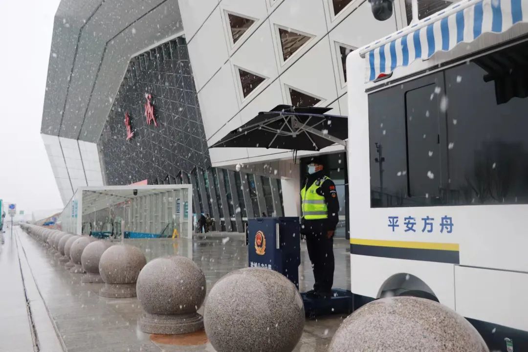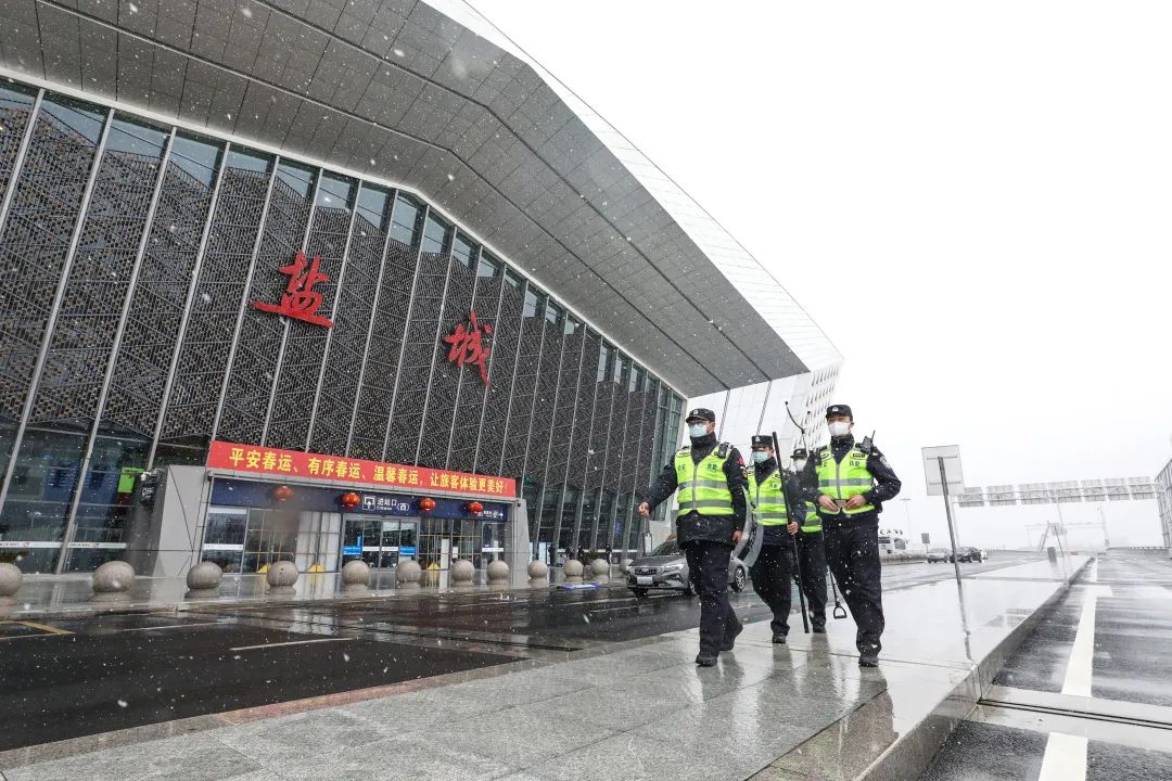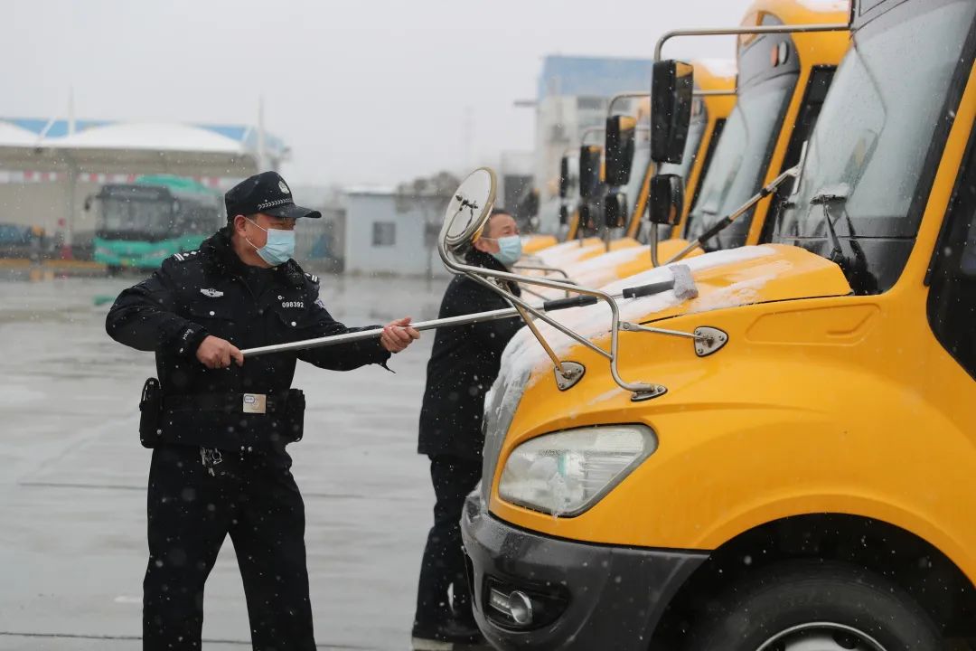 ▲大丰区公安局民警检查汽车站,帮助清除公交车上的积雪。