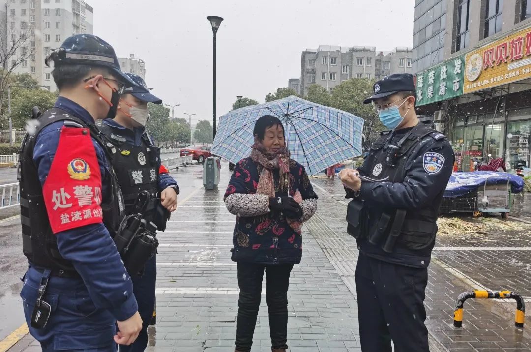 ▲盐都分局民警提醒行人注意出行安全。