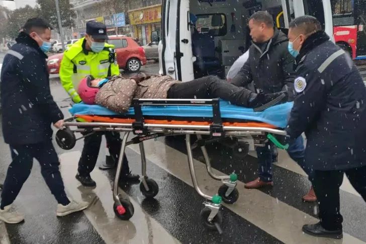 2月7日上午10许,阜宁县城哈尔滨路与徐州路交叉口,一辆汽车因雪天路滑,与周某驾驶的电动自行车发生碰撞,阜宁县公安局交警大队民警到达现场处理交通事故,并配合医护人员进行救助。因及时救助,周某并无大碍。