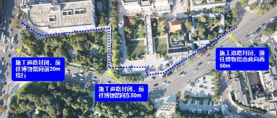 过往行人可沿乾隆行宫外围挡向西至博物馆大门,向北进入博物馆广场后沿围挡继续西行,到达博物馆现有西侧消防通道后北行至古玩城,沿古玩城现有东西向楼梯下行至中山南路。