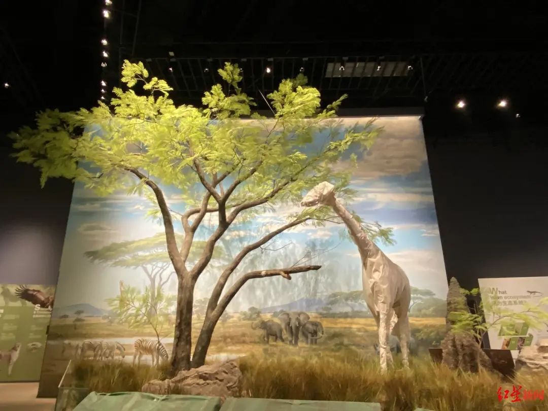 目前大象、长颈鹿标本用白色材料包装,多样化植被已经打造完成。伍枭表示,出于保护考虑,目前几个展厅中的矿物、动物标本大多数还未在现场进行展示,待展馆对外开放时才会进行布置。
