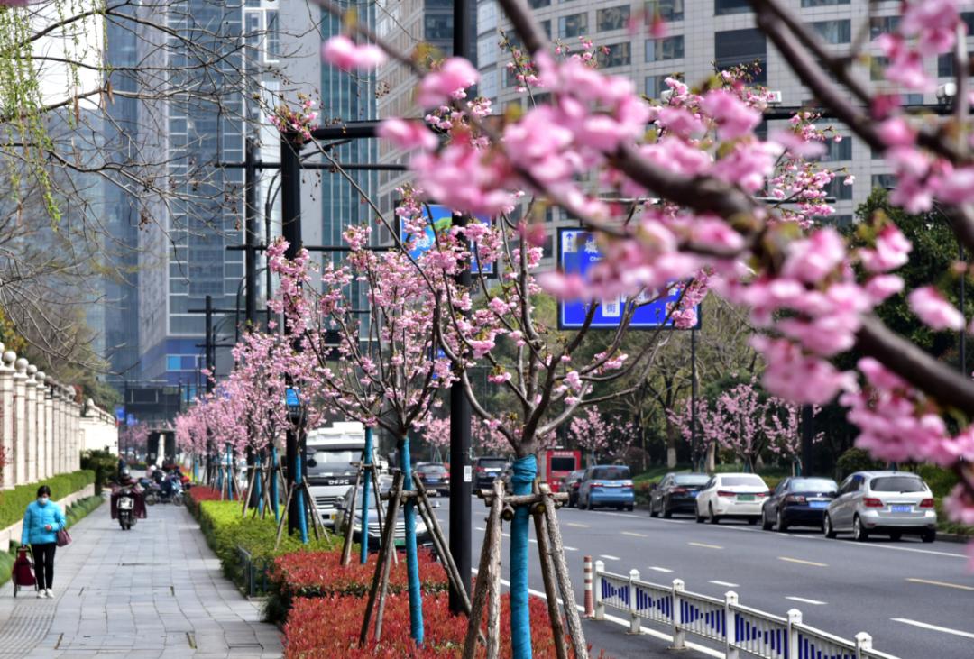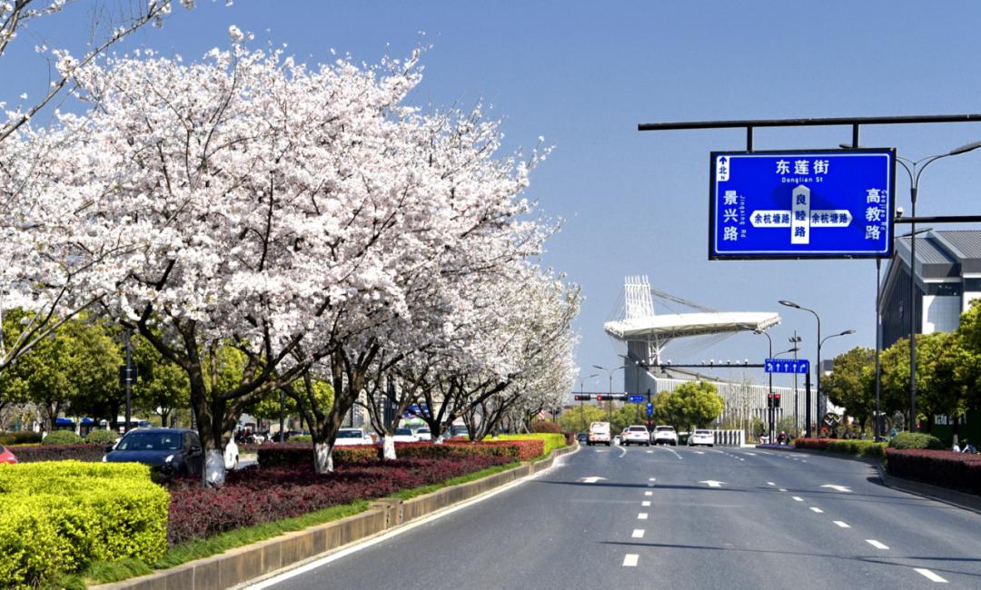 良睦路(文一西路—仓兴街),是余杭仓前通往杭州主城区的重要干道。中央绿化带是著名的樱花大道,经过提升改造,还增加了紫薇、月季等开花植物品种,四季有花,整体景观效果优越。