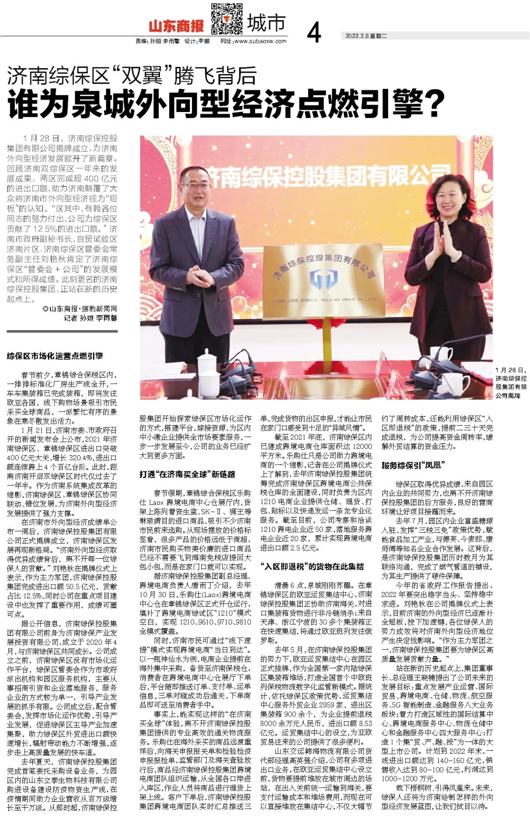 今年的省政府工作报告提出,2022年要突出稳字当头、坚持稳中求进。刘艳秋在公司揭牌仪式上表示,目前济南的外向型经济已逐渐补全短板,按下加速键,各位综保人的努力成效将对济南外向型经济地位产生决定性影响。“作为主力军团之一,济南综保控股集团要为综保区高质量发展贡献力量。”