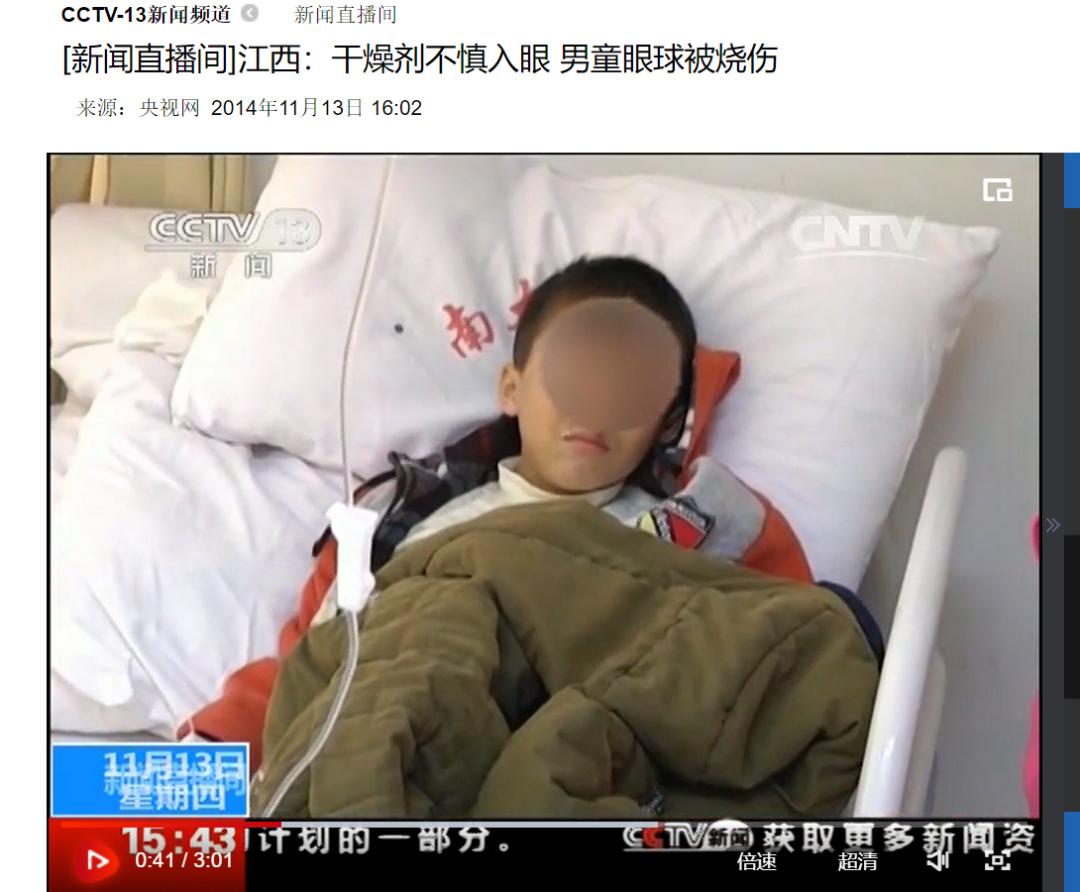 该消息确实与干燥剂遇水发生化学反应伤人有关,涉事人为江西的孩子,在南昌一家医院救治。根据当时报道,孩子眼部遭到灼伤,医生正努力救治,以避免碱性液体向孩子眼球渗透。但医生并未诊断“孩子眼球已经被溶化”。
