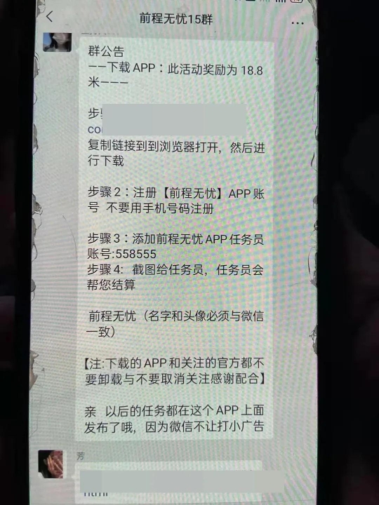 经了解,前几日张女士在网上找工作,有一天她收到了一条“你填写的工作申请通过了”的好友验证消息,张女士想着自己也确实在网络招聘上填写过资料,所以就通过了好友验证,然后就被对方被拉进一个有几十个群员的叫“前程无忧15群”的微信群,并告知其需要下载注册一个叫“前程无忧”App。该软件上有一项内容打着“中国慈善基金会捐赠返利活动”旗号的刷单任务。对方告诉张女士,只要她刷三单任务,就能成为他们正式员工,小心谨慎的张女士第一次选择“小试牛刀”向对方指定的账户转账40元,没一会儿对方就给张女士返回来50元。第二次,张女士转了300元,没想到对方又转回来360元。