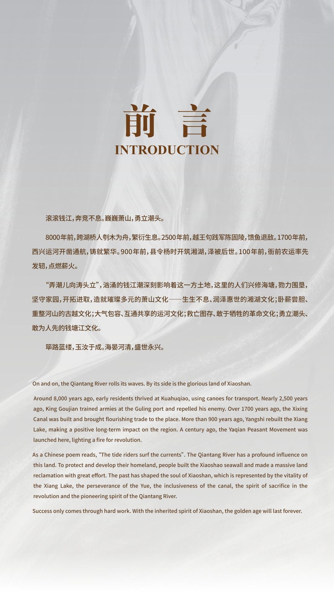 展览标题取自萧山三国时期的地名“永兴”,反映历代萧山人开拓进取、建设家园的心愿与精神,这既是对萧山辉煌过去的回望,也是对美好未来的展望。以“潮”文化串联起萧山五大文化——生生不息、润泽惠世的湘湖文化;卧薪尝胆、重整河山的古越文化;大气包容、互通共享的运河文化;救亡图存、敢于牺牲的革命文化;勇立潮头、敢为人先的钱塘江文化。