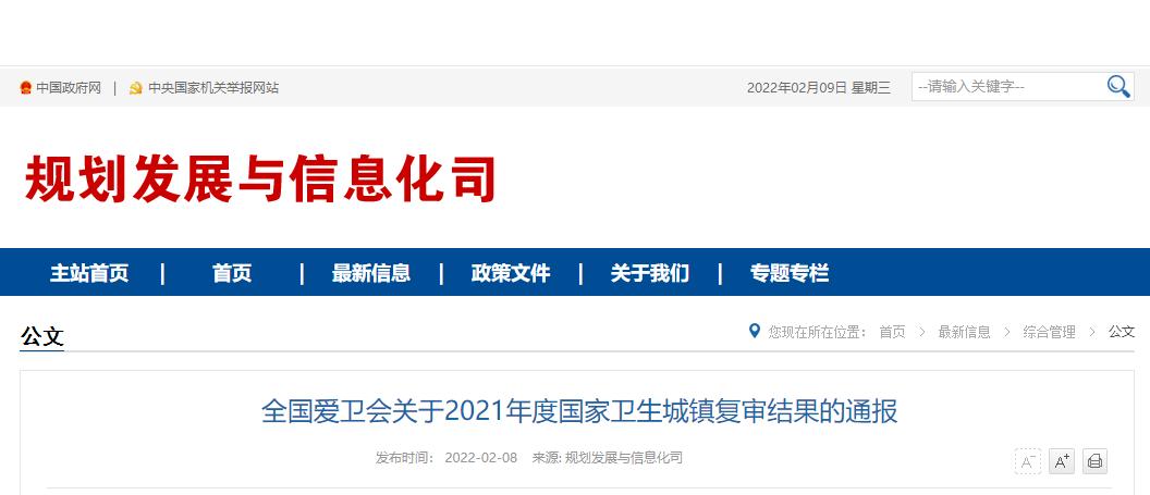全国爱卫会关于2021年度国家卫生城镇复审结果的通报