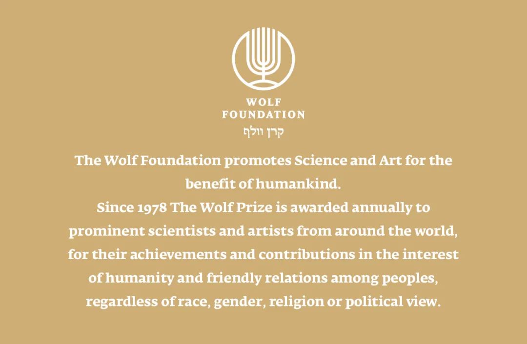 沃尔夫奖(Wolf Prize)由沃尔夫基金会颁发,是世界最高成就奖之一。主要是奖励对推动人类科学与艺术文明做出杰出贡献的人士,每年评选一次,分别奖励在农业、化学、数学、医药和物理领域,或艺术领域中建筑、音乐、绘画、雕塑四大项目之一中取得突出成绩的人士。每个沃尔夫奖奖项奖金为10万美元。