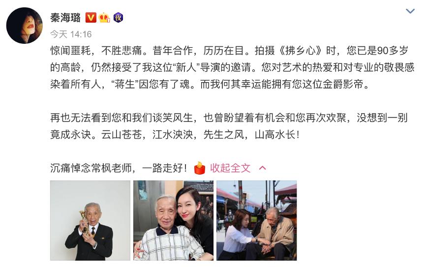 2月9日下午,演员秦海璐在微博发文悼念常枫,称“沉痛悼念常枫老师,一路走好!”