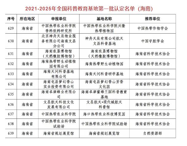近日,中国科学技术协会对2021-2025年全国科普教育基地第一批认定名单进行公示,海南省共有11家基地榜上有名。