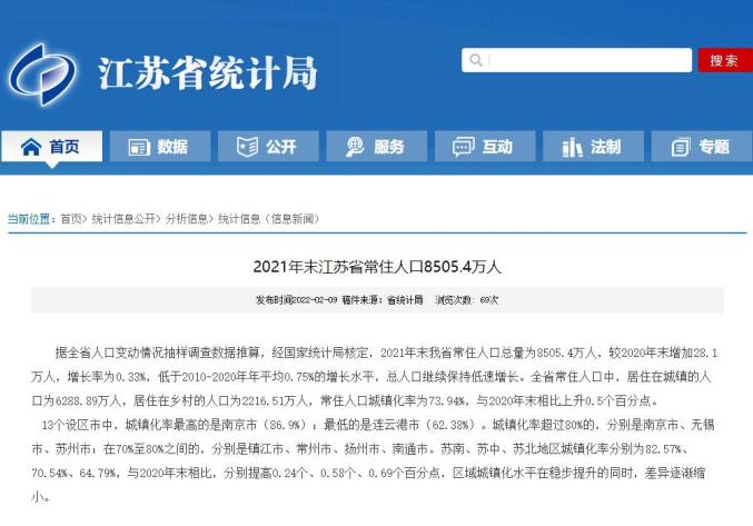 13个设区市中,城镇化率最高的是南京市(86.9%);最低的是连云港市(62.38%)。城镇化率超过80%的,分别是南京市、无锡市、苏州市;在70%至80%之间的,分别是镇江市、常州市、扬州市、南通市。苏南、苏中、苏北地区城镇化率分别为82.57%、70.54%、64.79%,与2020年末相比,分别提高0.24个、0.58个、0.69个百分点,区域城镇化水平在稳步提升的同时,差异逐渐缩小。