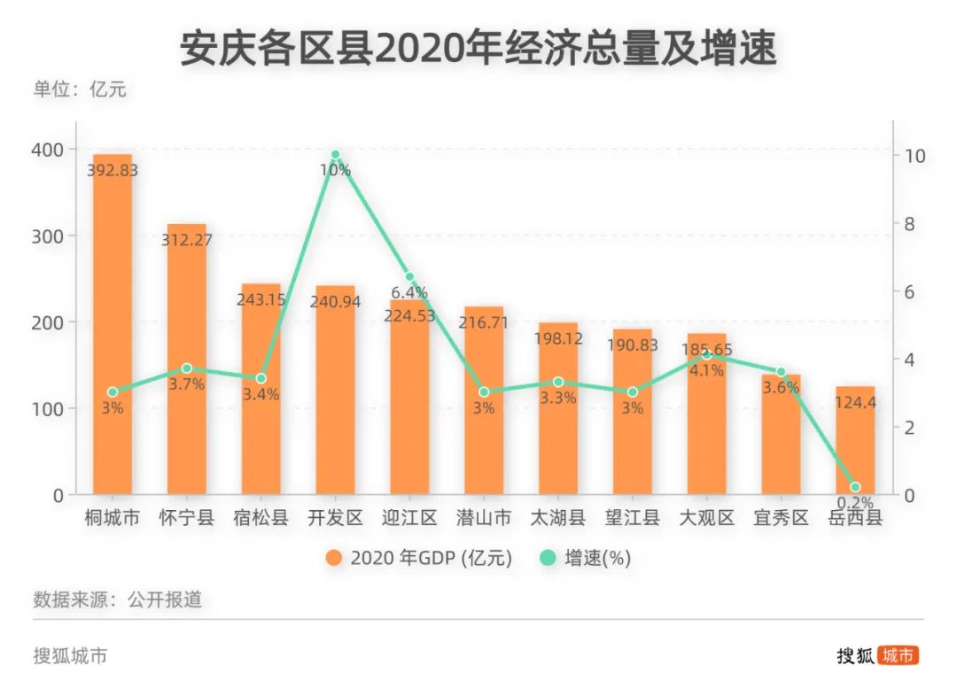以去年的经济数据来看,安庆6.6%的增速低于全省平均值8.3%,排在第13位,只比皖北的淮南、淮北、蚌埠要快。从总量看,安庆能排进前五,人均一下排名又落到十名开外。在安庆下辖区县中,桐城市是最肥的一块肉——经济总量占比超过15%(2020年为15.92%)。