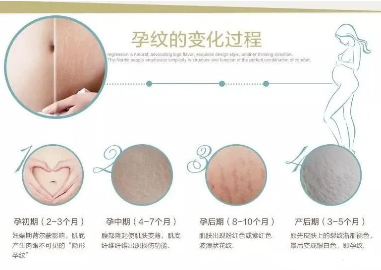 原因:孕期胎儿变大,或者体重增加过快,使得皮肤的胶原纤维和弹力纤维因拉伸速度超过了适应程度而产生断裂,皮肤就会出现红色的妊娠纹,随着时间慢慢变成银白色。妊娠纹较常出现在腹部、腰部、乳房、臀部、大腿根等部位。