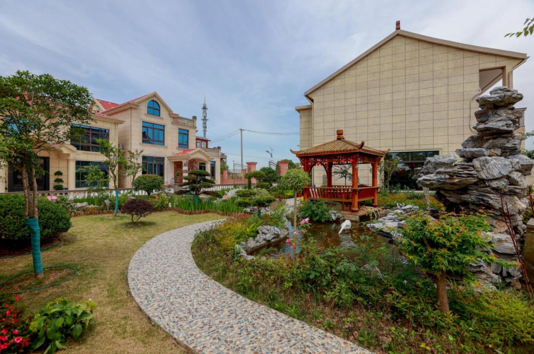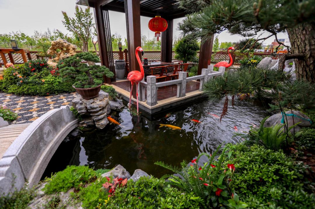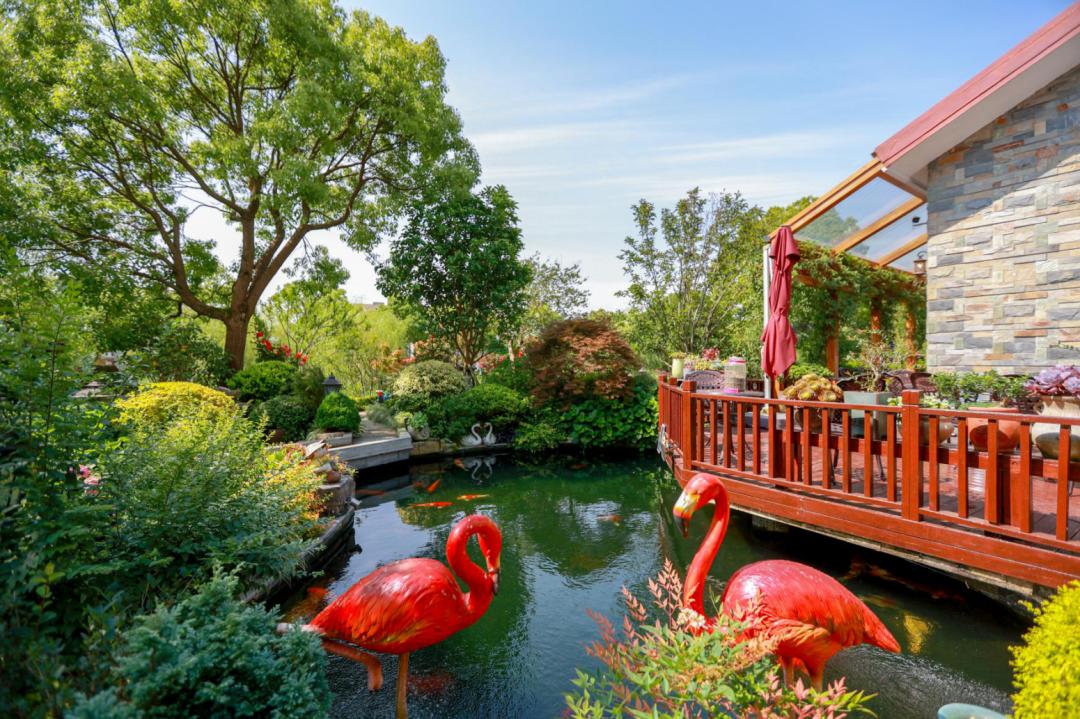 进入庭院,高大的迎客松、果树,娇艳欲滴的鲜花,各式漂亮的花盆映入眼帘。漂亮的火烈鸟站在后花园里,凉亭旁小池潺潺流淌,鱼儿尽情畅游。围墙外的上海之鱼与庭院内的美景相互辉映,形成水天一色的美丽风景。
