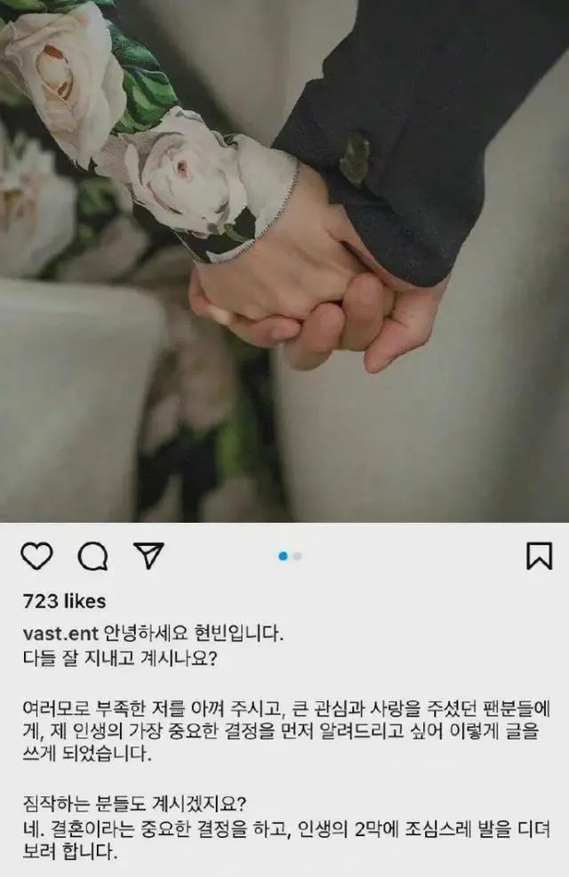 玄彬发文说:“我决定结婚,小心翼翼地踏入人生的第二幕,我和总是笑的她约定好了,以后的日子一起走下去。在作品中一起合作过的政赫和世莉要一起迈出一步。”