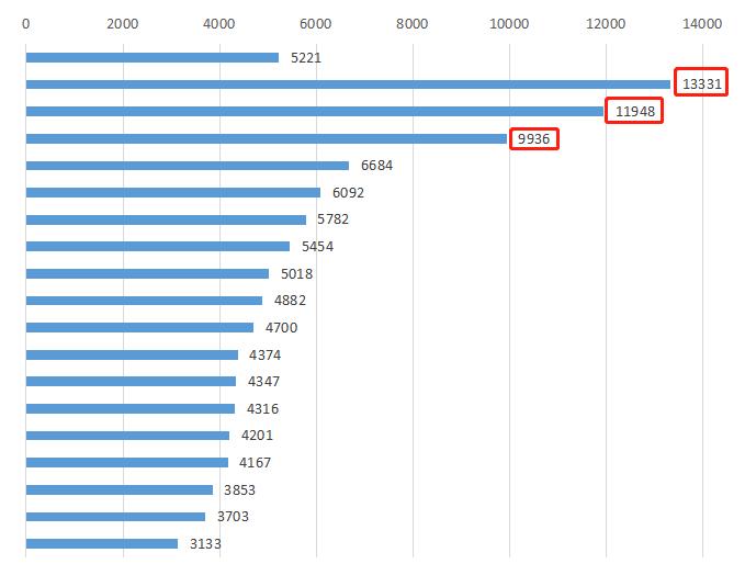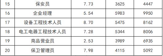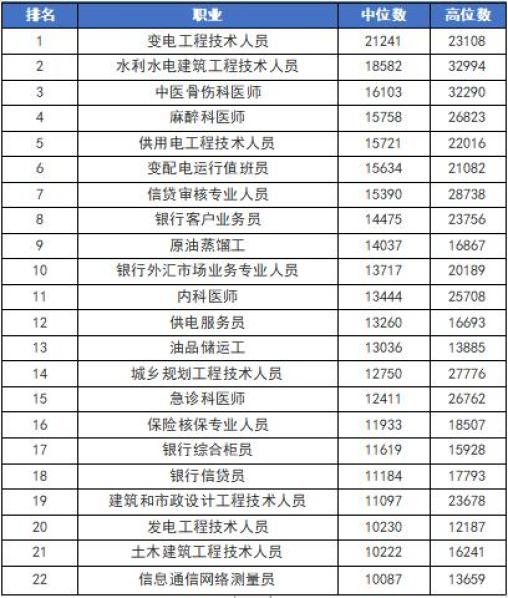 从高位数来看,排名最高的三个职业由高到低依次是:水利水电建筑工程技术人员32994元/月,中医骨伤科医师32290元/月,信贷审核专业人员28738元/月。