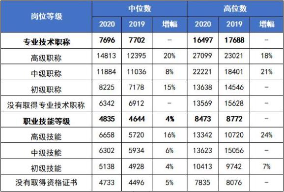 在高位数上,涨幅最大的是高级技能人才薪酬,涨幅达24%,中级职称和高级职称人才薪酬涨幅也达到了21%和18%,技能技术的升值潜力很大!