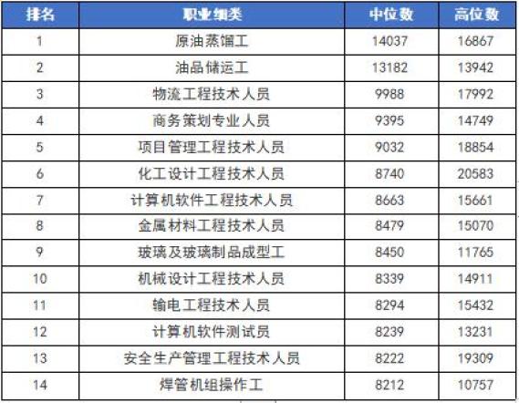 从高位数来看,排名最高的三个职业由高到低依次是:化工设计工程技术人员20583元/月,安全生产管理工程技术人员19309元/月,项目管理工程技术人员18854元/月。